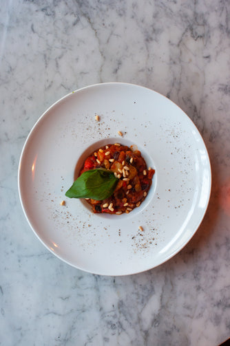 Süßsaures Gemüsegericht aus der sizilianischen Küche. Zutaten: Auberginen, Tomatensoße, Sellerie, Zwiebeln, Kapern, Oliven. Vegan!