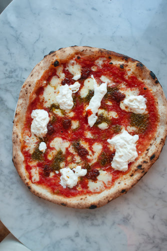 Tomatensauce | Fior di Latte Käse Aus Agerola | ‘Nduja (Würzige, Pikante Italienische Rohwurst) | Hausgemachter Basilikumpesto | Stracciatella di Burrata | Samenöl